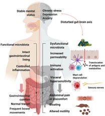 Physiologically, IBS is driven by a variety of factors. Gut-brain axis dysregulation or disrupted communication, often influenced by stress and diet, leads to altered signaling about pain, motility and stress responses. Abnormal gut motility leads to faster transit or loose stools (IBS-D) or slower transit causing hard stools (IBS-C) or alternating patterns of both. Gut microbiome alterations affect digestion, gas production, and immune system activity.  Neurotransmitter and hormone changes also occur which is why IBS symptoms often flare during stress.  None of these changes damage the gut structurally but cause significant functional symptoms. IBS disrupts normal gut function, leading to symptoms like bloating, cramping, and irregular bowel movements. These symptoms can come and go, making IBS unpredictable.